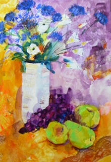 I joined some local Art Groups and more opportunity was opened for me to move forward. I retired from work, took over one of our bedrooms as a studio and made lots of new friends, who gave me help and encouragement. I continue to attend courses and workshops to keep my work fresh and learn new media and skills. I now dabble in most media but mainly Acrylic, Mixed Media and Watercolour. I think I have now found my own style which is free lively and colourful.